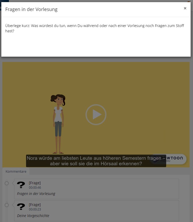 - Individuelle Einstellungsmöglichkeiten: Je nach Einstellungen sind Kommentare öffentlich oder anonym, werden immer angezeigt oder erst im Verlauf des Videos. Das Video kann direkt nach Beantworten einer Frage fortgesetzt werden oder muss zunächst manuell gestartet werden und das Schließen des Fragenmodals ohne vorherige Beantwortung kann unterbunden werden. Die Optionen sind hier vielfältig.