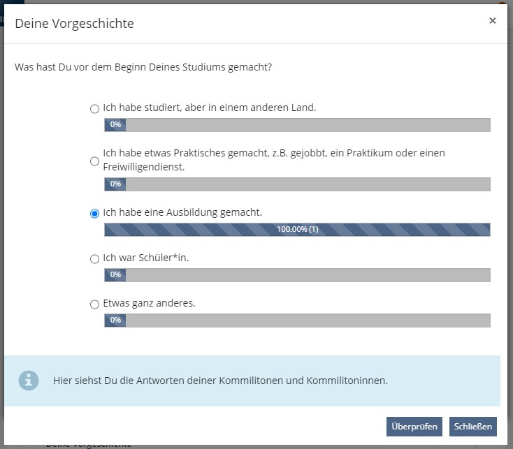 Die Antworten können anschließend vom Teilnehmenden selbst (nur eigene) sowie von Autor:innen (von allen Teinehmenden) eingesehen werden.