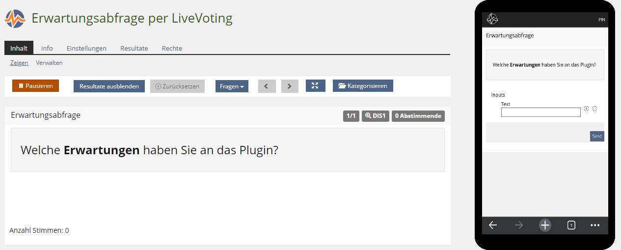 Das LiveVoting Plugin erweitert ILIAS um einen neuen Objekttypen: das LiveVoting. Damit können Umfragen mittels Pin oder QR-Code bspw. im Hörsaal zur Teilnahme geteilt und die Ergebnisse in Echtzeit angezeigt werden.